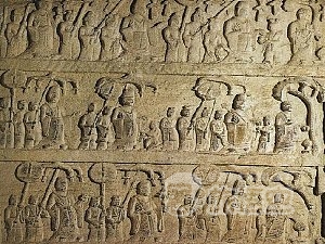 1500年という長い歳月の間に大部分が破壊されてしまいましたが、5窟の中で最大のものは、第一窟で、間口、奥行きとも6.5m、高さ6mに及びます。第二窟と第三窟の間には、幅27mの岸壁があり、そこに写真などでお馴染みの三尊仏が彫刻されていまする。この他に、小さい仏像は1000点ほど、彫像276点、石刻7759点が現在保存されています。 |